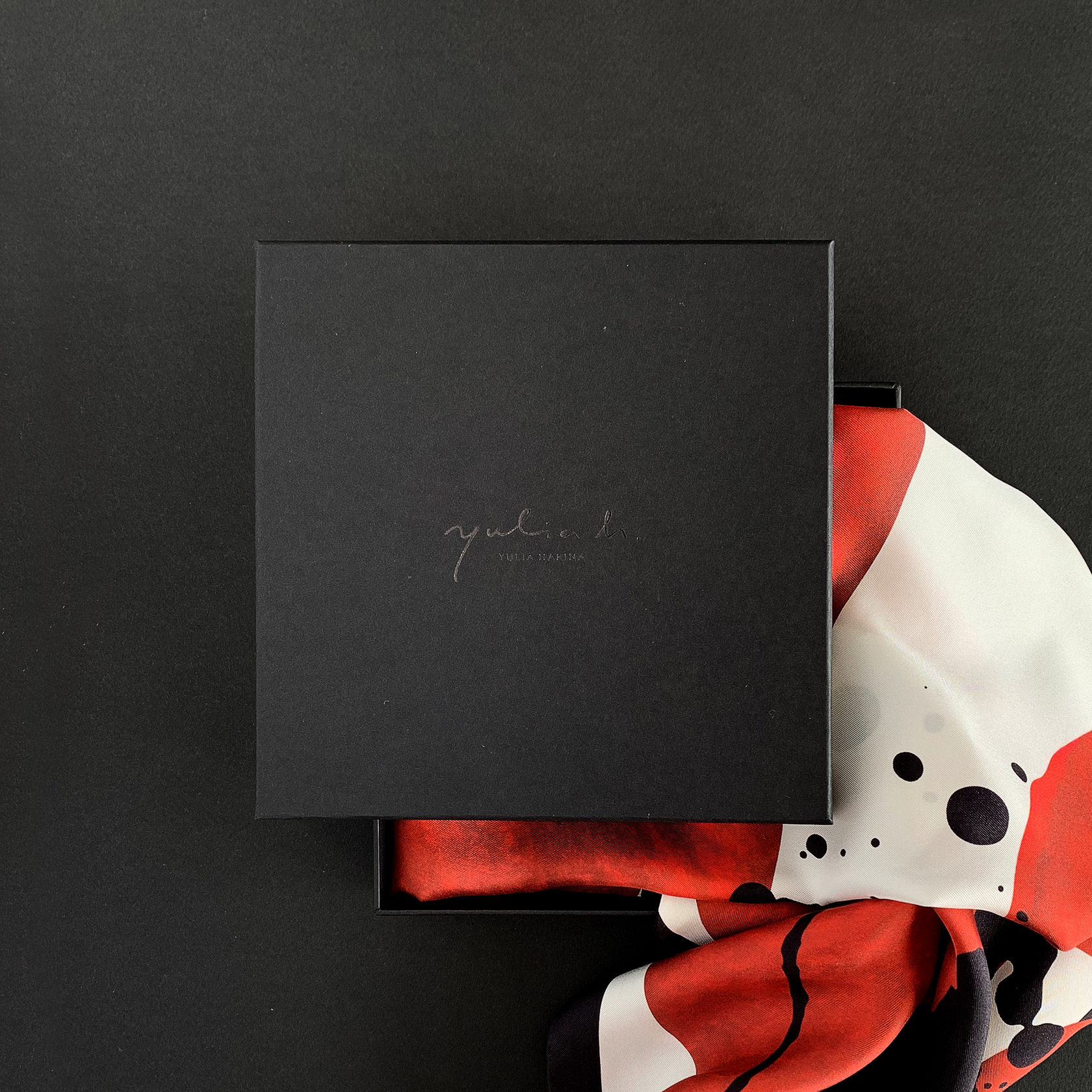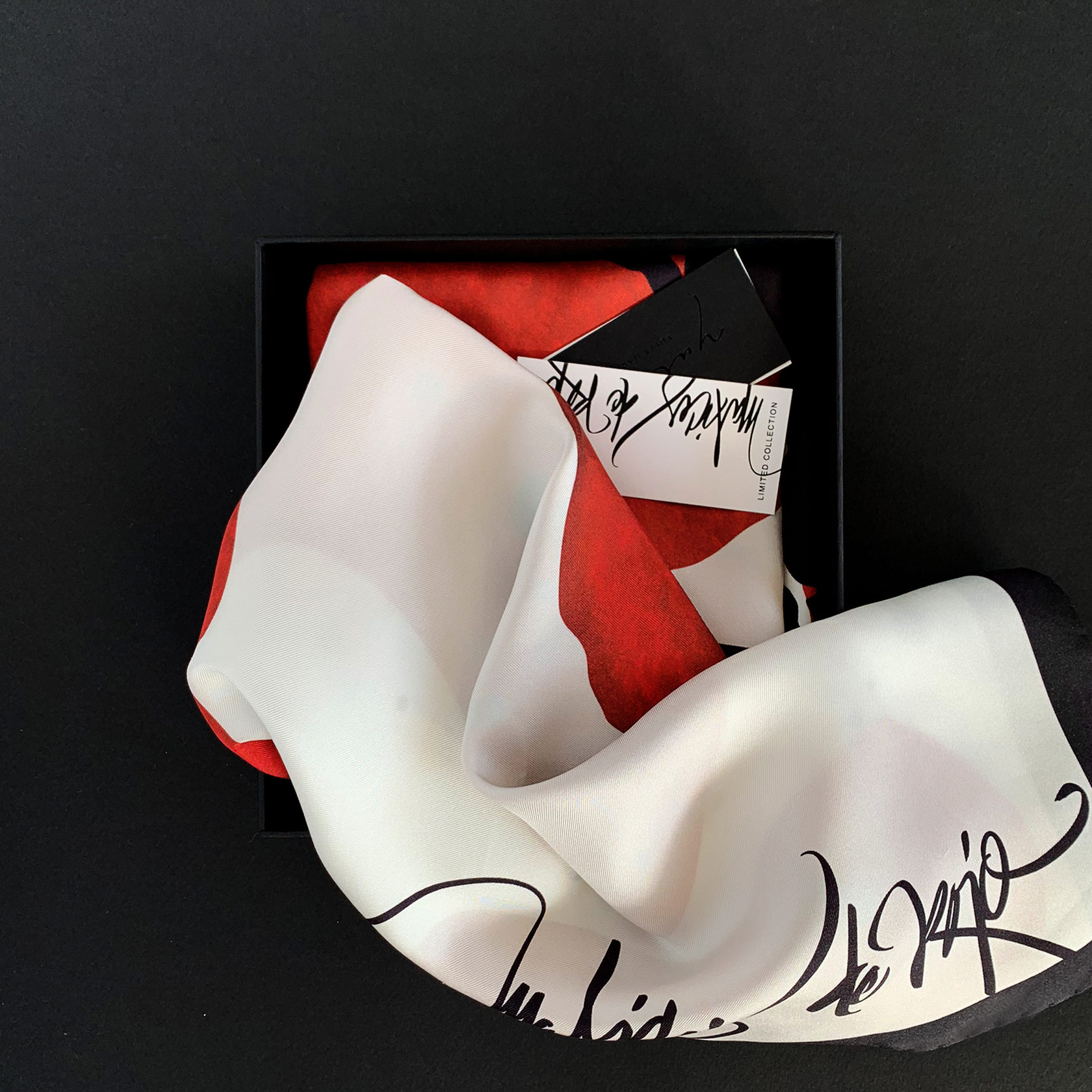 Limited editions «Matices de rojo. Shades of red» Natural silk 90x90 cm Each scarf has a quality certificate and a copy number. The scarfis packed in the branded box.