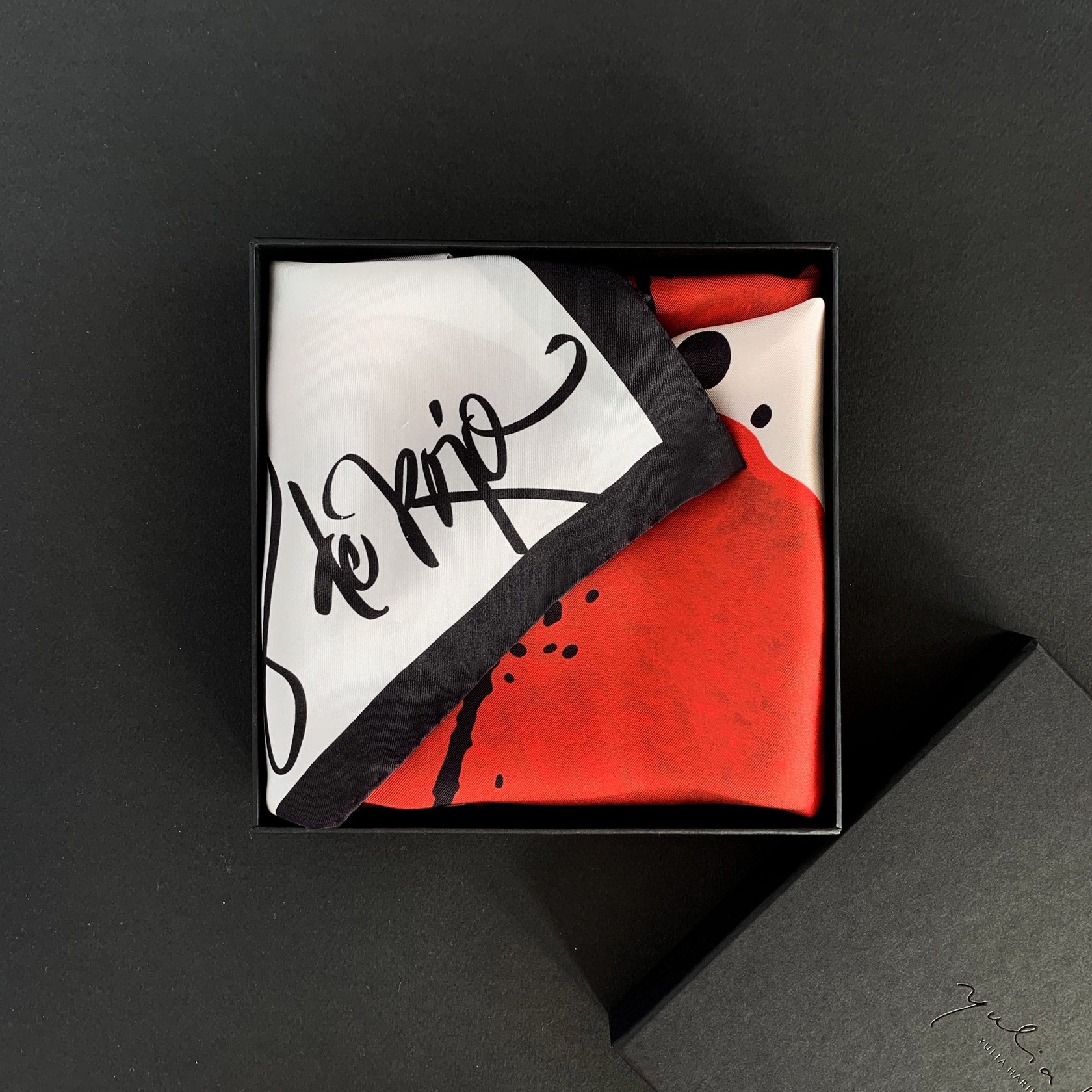 Лимитированная коллекция платков из натурального шёлка, в авторской технике на основе каллиграфии и акварельной живописи. Коллекция представлена в пяти дизайнах, каждый из которых выполнен всего в десяти копиях, более тиражироваться платки не будут. Каждый платок имеет сертификат с номером копии.